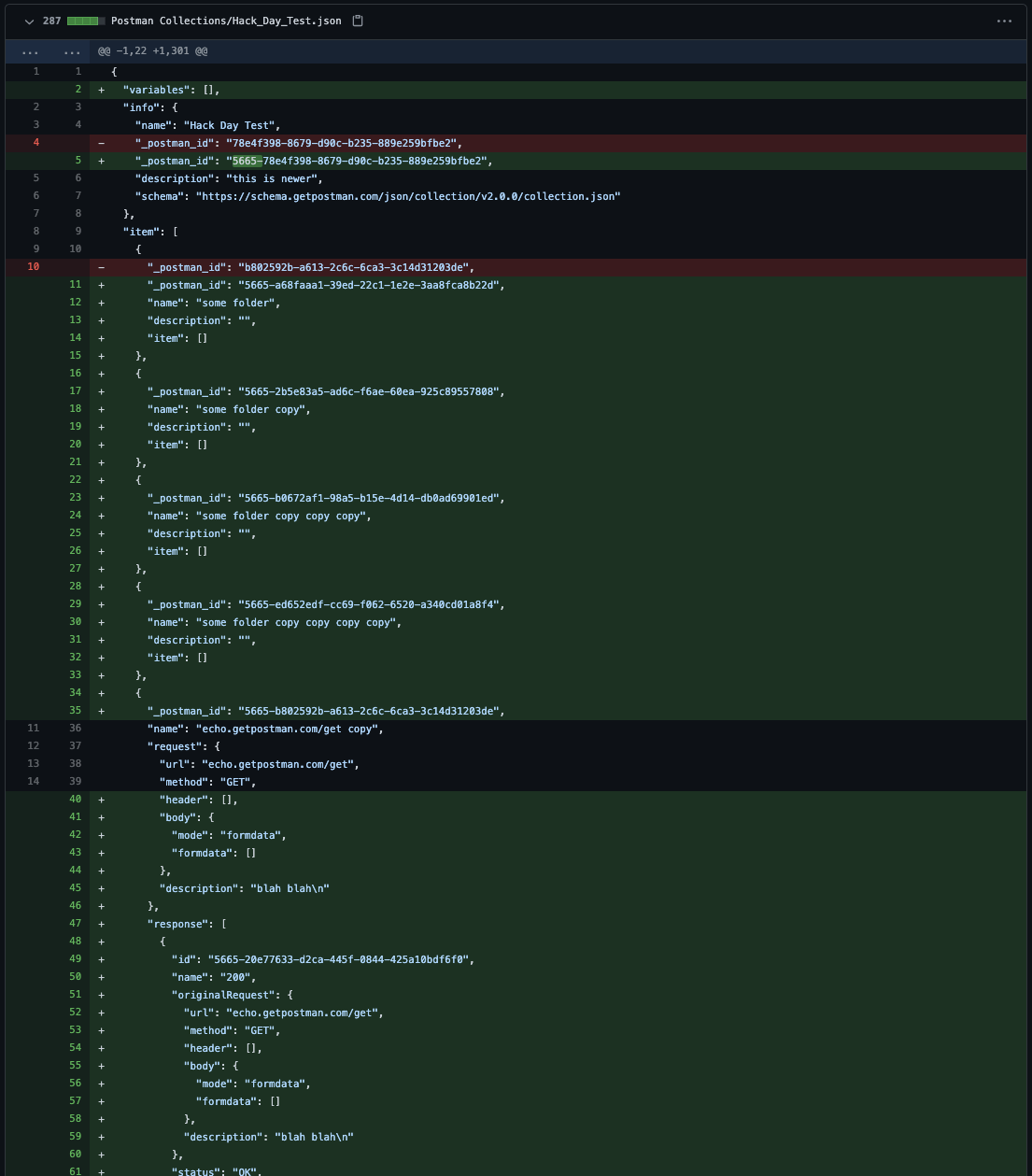 For a Collection, suppose, if I’m creating a new request or a folder, instead of showing multiple lines in a Git based diff which make no sense, the ideal experience would be showing it in the same way how we show requests or folders in Postman.